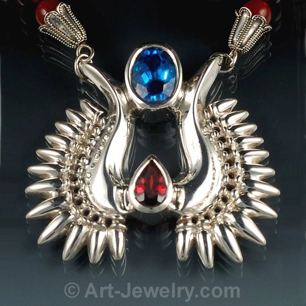Unique and imaginative designs inspired by the subconscious energy of gemstones are evident in this artistic jewelry creation in Sterling Silver. The subconscious energy emitted by gemstones contributed to the necklace's creativity and allowed ideas to flourish. Energy radiates on a flight of wings. The energy will also resonate with the wearer, enhancing their awareness of the vibrant properties of the gems.