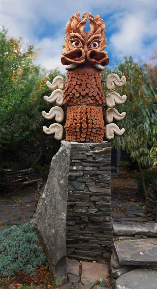 The dragon's skin is crafted from salt-glazed stoneware clay and is assembled in sections. It has a reinforced concrete interior, resulting in a dragon that combines a cement core with a clay exterior. Standing at seven feet eight inches tall and positioned high in a tree, it offers a vantage point that is visible from a second-story balcony.