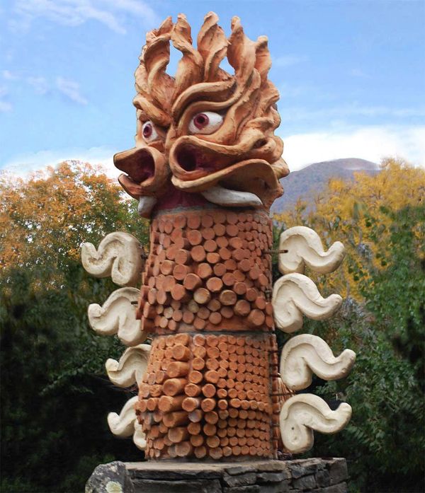 In 1973, we had the pleasure of meeting John Gardner, an author, scholar, philosopher, and arts patron. The New York Times critically acclaimed reviews of his book "Grendel" prompted the commission of a dragon sculpture. In this piece, the dragon is perched high in a silver maple tree, offering advice to anyone willing to listen, in contrast to the monster's lair in the novel.